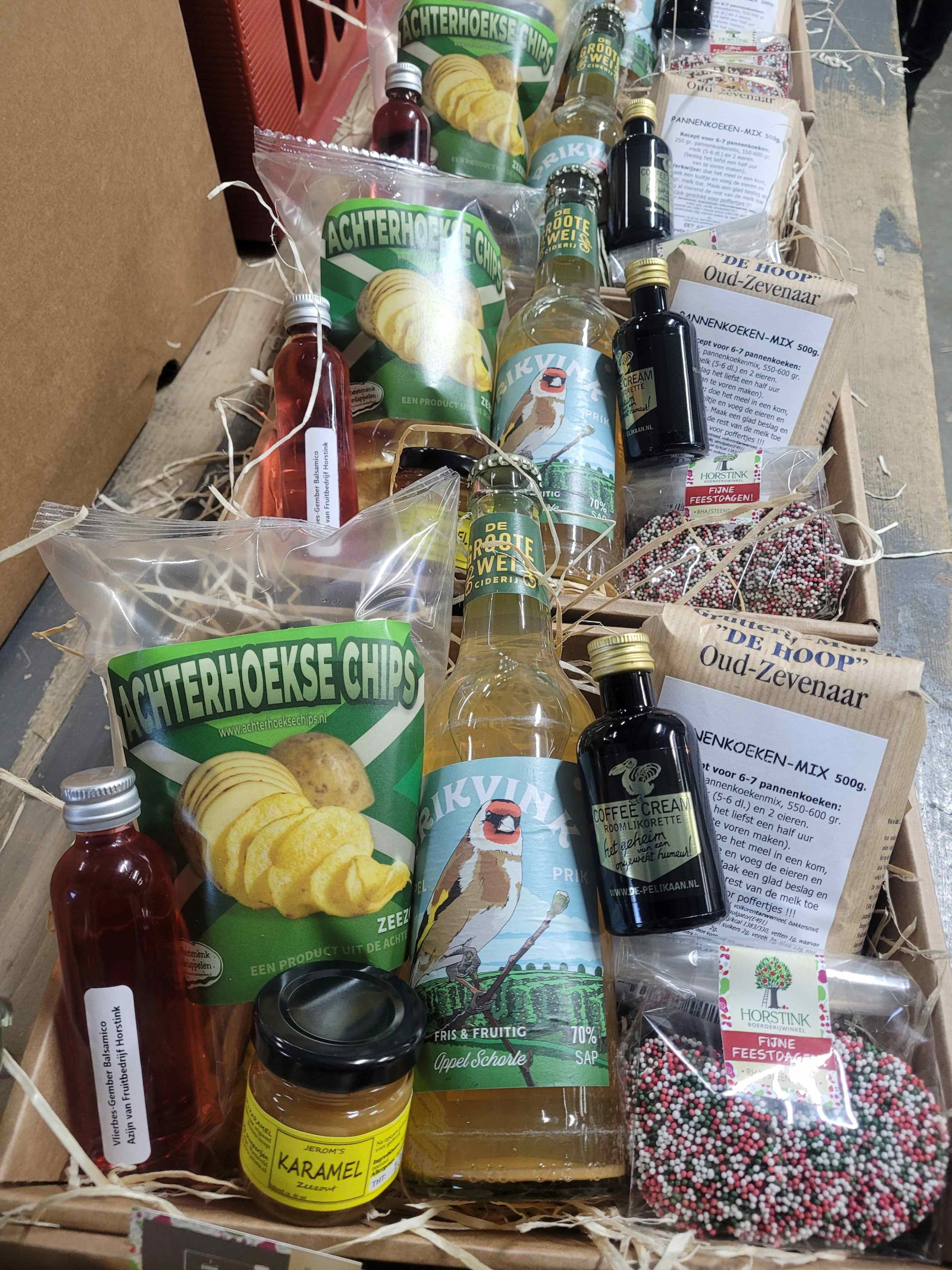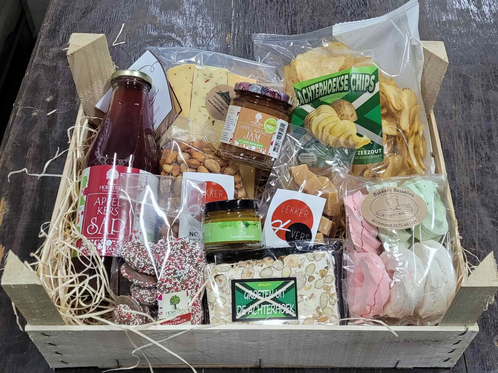 Klein of groot, we maken er iets moois van. Gevuld met heerlijke streekproducten, zoals onze appelsappen, jam's, een lekker stukje kaas, een van de vele Achterhoekse bieren of wijn, nootjes, chocolade, lekkers van de bakker en nog heel veel meer. Naar wens aangevuld met verse groente of lekker fruit.